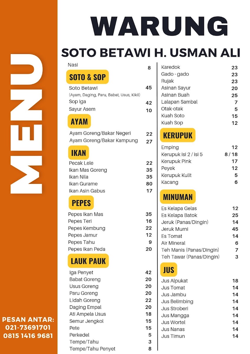 Welcome to Soto Betawi Pak H Usman Ali, a culinary gem nestled in Tangerang Selatan. Renowned for its authentic Betawi flavors, the restaurant invites you to indulge in an array of traditional dishes, with the signature soto betawi taking the spotlight. This delightful soup, rich with coconut milk, offers generous portions of tender meat, including options for those craving lung and liver.